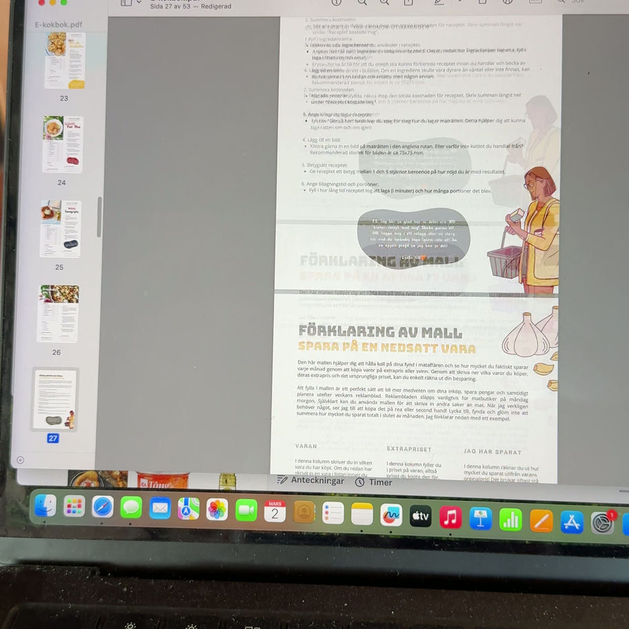 E-boken ger dig möjlighet till att vara kreativ, byta ut ingredienser i ett recept, räkna ut vad ett recept kostar, spara pengar på nedsatta varor, sätta sparmål, skapa din egen receptbok och utmana dig själv att laga mat för 100 kronor. Allt som jag hade önskat att ha i en och samma kokbok.